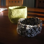 Nämät ”virkatut ” kulhot syntyi loman aikana mökillä. kirjava on vanha väriä päästänyt paitani ja keltainen on tehty vanhoista trikoistani. Näiden kulhojen virkkaamiseen kyllä taisin innostua oikein jonkin verran. Nyt tarvis saada vain punaista materiaalia, niin tulisi jouluksi monta astiaa. Nämä pannunaluset tehtiin myös mökillä. punaiset ovat vanhat trikoohousut, muut ovat tehty paidoista.